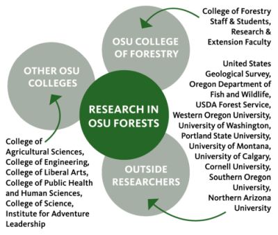 Since 1926, hundreds of research studies have been conducted across the College of Forestry’s 18,000 acres of research and demonstration forests. Researchers and educators from the College of Forestry, other colleges within OSU, other universities, agencies, non-profits and local schools use the OSU Research Forests as a living laboratory and classroom.